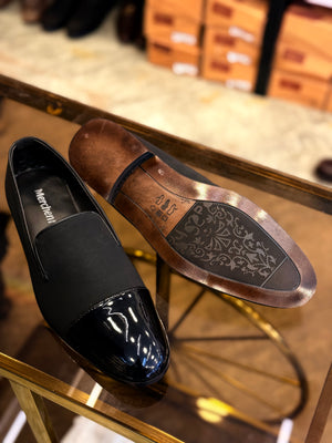 A sleek black suede patent formal shoe designed for a sharp, polished look.
